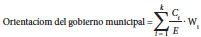 , Siendo: k = número de partidos que forman el gobierno; Ci = número de regidores del partido i; Wi = posicionamiento del partido i = media de la posición en el eje izquierda-derecha del partido i;