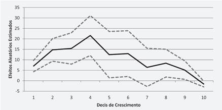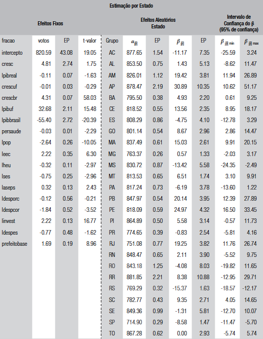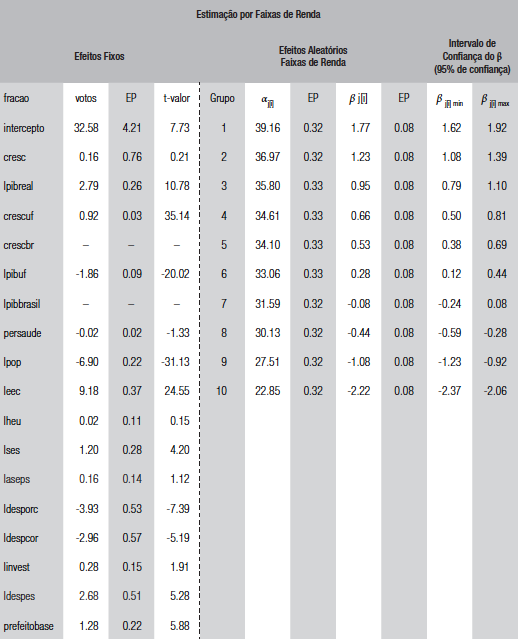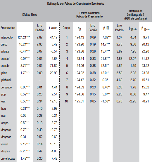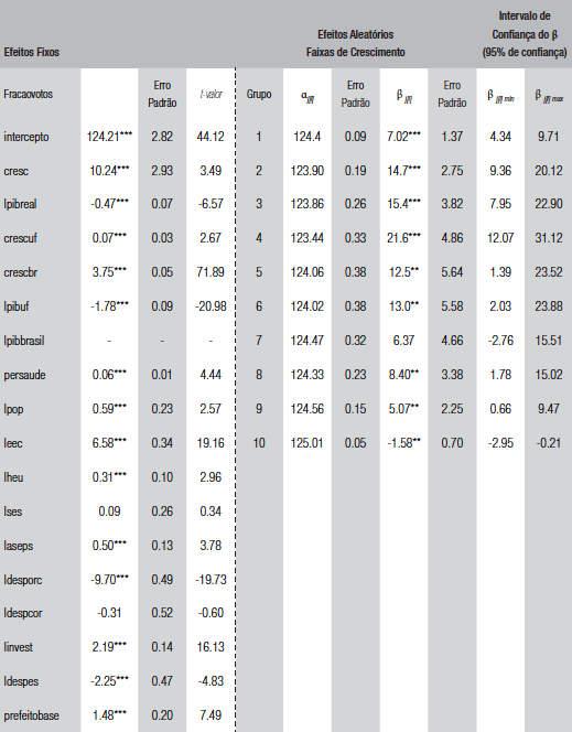 Os resultados são apresentados na tabela 4 e no gráfico 1, em que mostramos a variação do βj{;i} com seu respectivo intervalo de confiança ao longo dos 10 grupos ordenados de maneira crescente. Na tabela 4, apresentamos no lado esquerdo o resultado dos coeficientes fixos e do lado direito os coeficientes aleatórios. Os coeficientes fixos corroboram a análise anterior, mostrando efeito positivo - e significante - de crescimento econômico local (cresc), aliança entre prefeito e presidente (prefeitobase) e alguns gastos, enquanto encontra efeito negativo e significante do tamanho do PIB municipal e efeito positivo da população. Já no lado direito da tabela 4 apresentamos os coeficientes aleatórios tanto para o intercepto quanto para o efeito do crescimento econômico.6