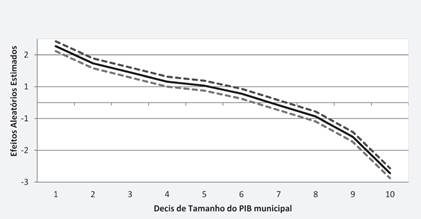No gráfico 2 são apresentados os resultados quando dividimos os municípios em 10 grupos, conforme os decis da distribuição do logaritmo do PIB real municipal, lpibreal, em cada ano. As estimativas indicam que há uma relação negativa entre o tamanho do efeito aleatório de crescimento e o logaritmo do PIB real,9 visto que o efeito sobre a votação esperada decai continuamente à medida que se passa a um decil de PIB real superior. Ou seja, o efeito do crescimento sobre a votação do incumbente é maior justamente nos municípios com menor economia. Isto posto, quanto maior for o município - o caso das grandes metrópoles e capitais brasileiras -, o efeito da economia sobre a escolha do voto é aparentemente menor. Ademais, a partir do 7o decil há uma inversão dos efeitos, e o crescimento econômico passa a afetar negativamente a votação do incumbente, um resultado que necessita de mais pesquisas para ser esclarecido. Uma possível explicação decorre do fato de que o crescimento acelerado é geralmente acompanhado por uma majoração da desigualdade, em um processo conhecido na literatura de economia regional como curva de Williamson (1965) e sobre a renda individual das pessoas como curva de Kuznets (1955). Assim, o efeito negativo pode ser decorrente do crescimento da desigualdade, um ponto que merece maior investigação empírica.