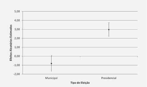No gráfico 3 fica claro que o coeficiente da inclinação é substantivamente maior nas eleições presidenciais, tendo em vista a enorme diferença entre os respectivos intervalos de confiança. Em síntese, o voto econômico parece ser muito mais importante nas eleições presidenciais, o que indica um maior grau de responsabilização por parte do eleitor pelo desempenho econômico local para o Executivo Federal do que nas prefeituras brasileiras, inclusive o efeito encontrado nas eleições municipais tem coeficiente negativo, mas insignificante.