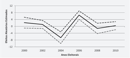 O quarto nível analisado repete a estimação feita nas colunas 4 a 6 da tabela 3por uma nova estratégia. Enquanto no referido modelo introduzimos as dummies de ano nos modelos de painel, agora incluímos os anos como um nível, sendo cada ano eleitoral entre 2000 e 2010 um grupo. No gráfico 4 apresentamos os coeficientes aleatórios de crescimento e os respectivos intervalos de confiança das estimativas realizadas para cada ano. No que se refere às variações no coeficiente de interesse, ou seja, o impacto do crescimento econômico, o gráfico 4 mostra que o efeito econômico = não podem ser distinguidos estatisticamente de zero para todos os anos, com exceção de 2004 e 2006, quando os efeitos são significantes. Contudo, em 2004 o efeito é negativo e em 2006 é positivo. Tal variação demanda mais pesquisas com foco em efeitos heterogêneos para entender a dinâmica do voto econômico, que se mostrou bastante variável em cada ano.