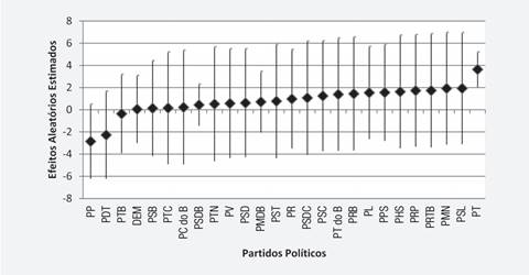 No gráfico 5 fica claro que os partidos que apresentam a menor relevância são o PP e o PDT, contudo seus intervalos de confiança são grandes, o que tira a significância dos resultados. Os achados com maior precisão são os resultados de PSDB e PT. O efeito do crescimento econômico é aparentemente nulo para os tucanos, uma vez que o valor estimado é muito próximo do zero. Já, por outro lado, o PT apresenta um efeito consistentemente positivo do crescimento sobre a votação do incumbente. Ademais, não parece existir um ordenamento ideológico claro desses efeitos, uma vez que encontramos partidos de esquerda com efeitos negativos e positivos (PDT e PT, respectivamente). Por outro lado, os grandes partidos do centro e da direita brasileira não indicam ser eficientes na transformação do crescimento econômico em votos, uma vez que estão concentrados na parte negativa ou muito próxima do efeito nulo do gráfico. Os partidos campeões em voto econômico são, além do próprio PT, os pequenos partidos com tendência ao adesionismo político.
