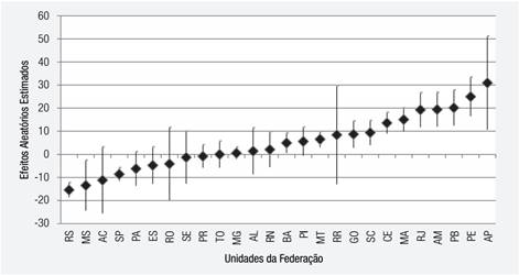 Por último, no sexto e último nível analisamos o modelo com a inclusão do nível dos estados brasileiros. Conforme podemos ver, os estados apresentam uma sensibilidade bastante variada para o voto econômico. Enquanto uns apresentam intervalos de confiança cujo limite superior se aproxima de 50.0, em outros o limite inferior aproxima-se de -20.0. Os estados brasileiros com maior impacto do voto econômico são Pernambuco e Amapá e os menores, Rio Grande do Sul e Mato Grosso do Sul. O eixo horizontal está ordenado de maneira crescente de acordo com o grau de “economismo” eleitoral observado nas eleições de 2000 a 2010 em cada estado. De um lado, no Rio Grande do Sul e em São Paulo, estados com economia bastante diversificada, o efeito do crescimento econômico local é menor, negativo e significante, enquanto o efeito estimado para o Paraná é negativo, mas não diferente de zero, assim como em Minas Gerais o efeito estimado foi positivo, mas também não significante. Dos cinco maiores estados brasileiros, apenas o Rio de Janeiro apresentou um coeficiente positivo, relevante e significante de voto econômico.11