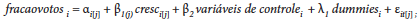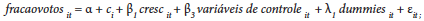 (1)em que i se refere ao município, t ao ano e α, ci e εit são, respectivamente, a constante, o efeito fixo municipal e o erro idiossincrático; cresc é a variável independente de interesse e fracaovotos, a variável dependente. A variável fracaovotos indica qual é a porcentagem de votos válidos (excluídos votos brancos e nulos) que o candidato incumbente obteve. O regressor cresc é a taxa de crescimento do PIB real municipal, que, dado nosso arcabouço teórico-metodológico, é utilizada aqui como forma de mensuração do crescimento econômico no ano das eleições presidenciais e municipais. Já nos modelos multiníveis, a equação básica estimada é ligeiramente distinta, incluindo dummies para os níveis:
