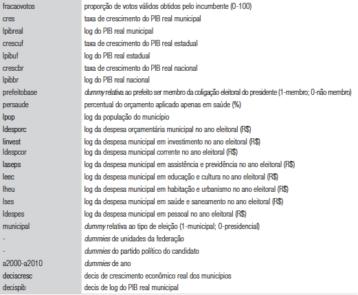 Escolhemos também algumas variáveis econômicas de controle em outros níveis de agregação regional, com implicações tanto econômicas quanto políticas, para separar os efeitos das diferentes ordens de crescimento econômico. Além das variáveis de nível e crescimento do PIB municipal real, incluímos também variáveis de nível e crescimento tanto do PIB estadual real quanto do PIB nacional. Os outros fatores macroeconômicos agregados foram controlados por meio da inclusão das dummies de ano.