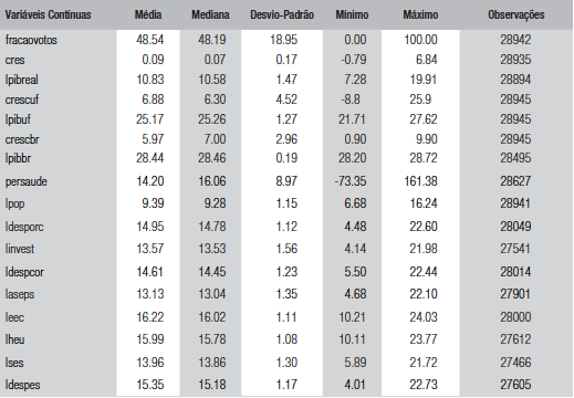 Optou-se por utilizar a fração de votos do incumbente como a variável dependente deste estudo. Uma maneira alternativa seria usar uma variável que capta se o incumbente foi vitorioso ou não. No entanto, escolheu-se a primeira estratégia, visto que o emprego de uma dummy para vitória implica não apenas um bom desempenho, mas sim um resultado nas urnas suficientemente positivo, que implique o sucesso eleitoral. Neste caso, estaríamos medindo se o desempenho econômico permite ultrapassar um patamar mínimo de votos, que é condicionado à eleição em questão. Usando-se a fração dos votos, temos um termômetro mais sensível para captar o impacto do desempenho econômico, que pode ou não ter sido suficiente para sacramentar uma vitória nas urnas.