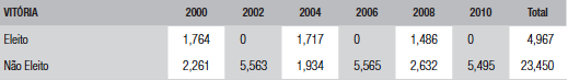 Indicamos como vitorioso o candidato incumbente eleito no 1o turno ou que obteve uma vaga no 2o turno. Consideramos como perdedor os candidatos que foram classificados como “Não - Eleitos” pelo TSE. Os resultados definidos como “Registro Negado” ou “Renúncia/Falecimento” foram considerados informação faltante, uma vez que a não vitória não foi fruto de uma derrota no processo eleitoral. Na tabela 11 apresentamos a estatística descritiva por ano, onde fica claro que existe apenas variação na variável dependente nas eleições para prefeito, e na tabela 12 os resultados em modelos lineares e em regressão logística.