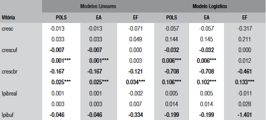 Resultados: modelos lineares e logísticos para a variável vitória