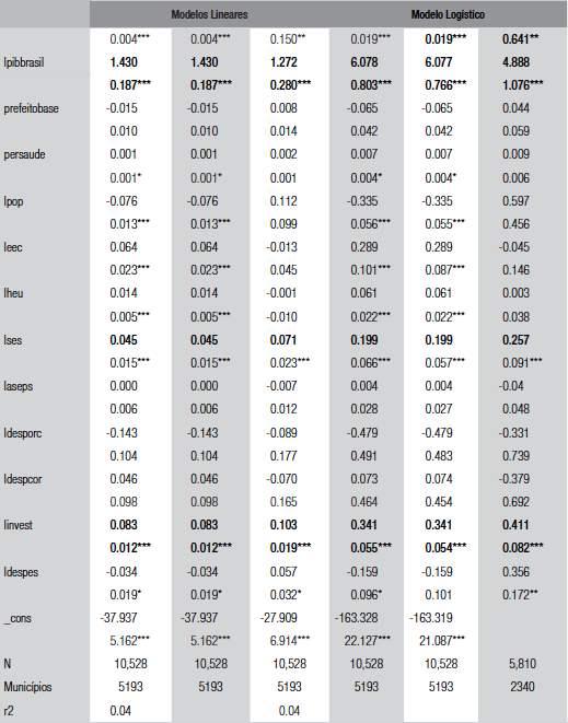O papel de o prefeito compor a base do governo é positivo e estatisticamente significante, em todos os modelos, sugerindo existir um impacto relevante nas eleições entre a existência de uma aliança partidária do partido do presidente e do prefeito. Trata-se de um resultado extremamente interessante dado que, a despeito do peso das transferências involuntárias no orçamento dos municípios, que são automáticas e desvinculadas das relações políticas, ainda assim, ao menos potencialmente, é relevante eleitoralmente uma maior proximidade política entre presidente e prefeito. Nesse sentido, a despeito de a variável de crescimento econômico ser local, não se pode rejeitar que existe uma identificação com o presidente, sugerindo o reconhecimento de uma responsabilidade quanto às políticas de crescimento com o chefe do executivo federal.