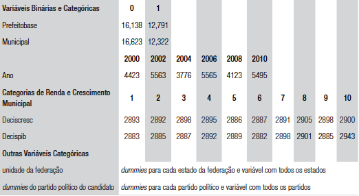 A amostra analisada neste artigo cobre 5.565 municípios brasileiros entre as eleições de 2000 e 2010.4 Conforme descrito a seguir, o banco de dados inclui cinco tipos de variáveis: políticas, econômicas, fiscais, demográficas e geográficas, sendo as três últimas usadas como controle nas estimações. A equação básica a ser estimada é a seguinte: