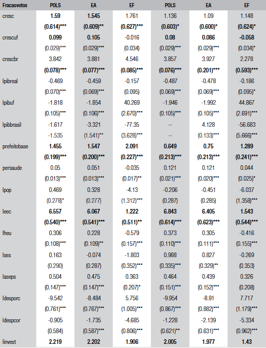 Apesar de ser de grande interesse a estimação dos efeitos da economia nacional, o pequeno número de anos disponíveis em nosso banco de dados, com apenas seis eleições, impede que esses efeitos sejam estimados com precisão. Desta forma para controlar os efeitos gerais da economia nacional, optamos pela inclusão de dummies de ano (Wooldridge, 2002). Contudo, incluímos dois tipos de variáveis macroeconômicas na análise que são fundamentais para o argumento aqui elaborado. Em primeiro lugar, o próprio crescimento do PIB regional e nacional (mensurados para os estados e para o país, respectivamente) e o nível dos PIBs reais estaduais e nacional.