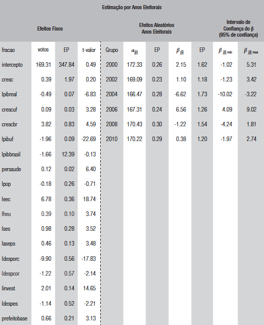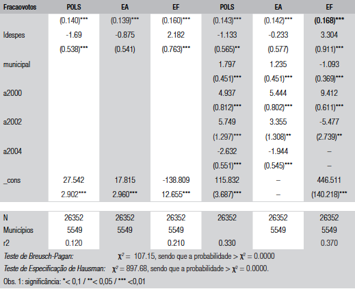 O desempenho eleitoral do incumbente será estudado, portanto, em duas etapas. Na primeira, o voto econômico é analisado por meio de dados em painel, que permite, conforme exposto anteriormente, controlar idiossincrasias não observáveis - ci dos municípios, choques exógenos, além de aumentar a precisão das estimações (Hsiao, 1986). Estimamos a relação por meio de técnicas de dados em painel que permitem analisar se as idiossincrasias não observáveis afetam ou não a estimação. Para isso, usamos os três modelos tradicionais de painel estático: painel empilhado, efeitos aleatórios (EA) e efeitos fixos (EF). Vale lembrar que a análise de efeitos fixos (EF) supõe que o efeito específico seja tratado como um parâmetro a ser estimado e, assim, o ci pode estar correlacionado com os outros regressores.3
