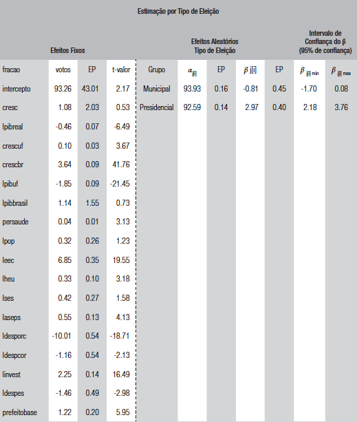 O terceiro nível é um exercício para verificar qual eleição é mais afetada pelo voto econômico. Nesse nível, analisamos se a inclinação do βj{;i} é diferente nas eleições presidenciais e municipais, isto é, se existe sensibilidade maior para os efeitos da economia sobre a votação do incumbente. Na seção anterior, identificamos que os candidatos a prefeito incumbentes em média tendem a ter menos votos do que os candidatos incumbentes presidenciais. No modelo de efeito fixo,10 encontramos a informação de que os candidatos incumbentes às prefeituras têm em média 1.1 ponto percentual a menos do que os presidenciais. Agora o exercício é diferente. Identificamos neste momento se existe diferença em como a economia afeta a política para candidatos incumbentes à prefeitura ou à presidência.
