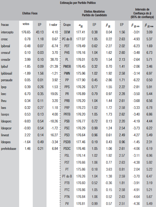 Os principais resultados confirmam evidências no sentido da existência de uma relação firme entre crescimento econômico local e votação obtida pelo incumbente em todos os modelos estimados por painel. Além disso, os gastos municipais com saúde, educação e cultura, além do volume de investimentos, também se mostraram positivamente associados a uma maior proporção de votos do incumbente. Outra importante constatação foi que a conexão partidária entre prefeitos e presidentes possui um efeito positivo no desempenho do incumbente.