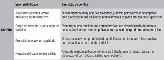 Os conflitos descritos neste artigo referem-se às incompatibilidades entre exigências decorrentes dos diferentes papéis desempenhados pelos juízes. De acordo com os critérios sugeridos por Rizzo e colaboradores (1970), esses conflitos são classificados como: (a) padrões e valores profissionais definidos no papel tradicional dos juízes (conflito atividades administrativas/judiciais); (b) recursos e habilidades necessárias para desempenhar um papel específico (conflito carga de trabalho/mão de obra); e (c) diferentes requisitos organizacionais embutidos em políticas e leis (conflitos produtividade/qualidade e responsabilidade/salário). O quadro 1 resume os principais conflitos apresentados e discutidos.