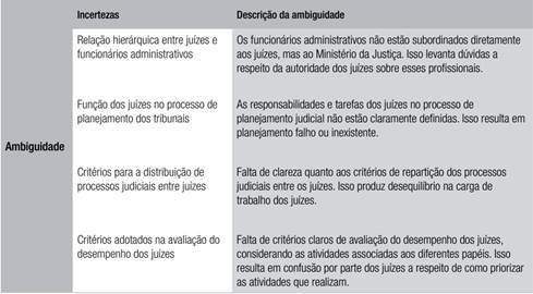 Todas as ambiguidades de papel descritas nas entrevistas abrangem lacunas na comunicação das organizações responsáveis pela gestão do Judiciário junto aos juízes. Esse fato reforça o entendimento de que tal comunicação deve ser claramente articulada pelas organizações em termos de comportamento e desempenho (Kahn et al., 1964). O quadro 2 apresenta um resumo das principais ambiguidades no trabalho, mencionadas pelos juízes entrevistados. Também são apresentadas as incertezas que caracterizam as ambiguidades, bem como uma descrição de cada ambiguidade.