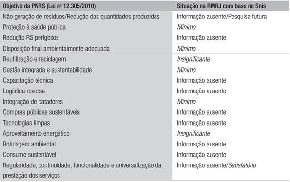 No entanto, para os outros seis objetivos, juntando as informações quantitativas e qualitativas do Snis, é possível definir um quadro de gestão ainda incipiente, quando não insatisfatório com relação às metas da PNRS.