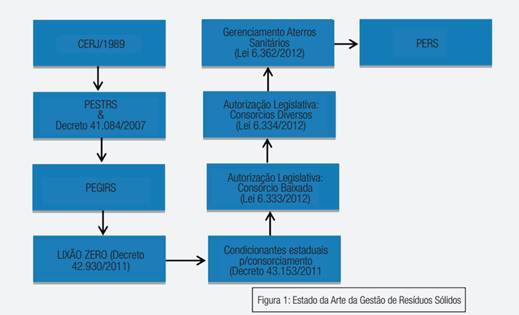 No estado do Rio de Janeiro, desde a promulgação da sua Constituição em 1989 (Cerj), vêm sendo instituídos políticas, planos e programas destinados à organização do setor de resíduos sólidos (figura 1). Mediante a Lei no 4.191, de 30 de setembro de 2003, o estado do Rio de Janeiro estabeleceu sua Política Estadual de Resíduos Sólidos. A política, como ato regulatório do setor, proporciona definições, normas, procedimentos e critérios para acompanhar todas as fases do processo de gestão dos resíduos sólidos, desde a geração até a disposição final, passando pelas fases de coleta e transporte. Esta estabelece proibições, como o lançamento de resíduos a céu aberto (art. 3, 1.1), assim como diretrizes e instrumentos de gestão, como o planejamento, a certificação ambiental e as atividades de auditorias, bem como os programas de incentivo às empresas para redução de embalagens e o emprego de produtos do reúso no ciclo produtivo (art. 15, I, II, III, IV). A Lei no 6.805/2014 amplia e integra a Lei no 4.191/2003 introduzindo a disciplina da logística reversa e listando, antes de tudo, as categorias de fabricantes e comerciantes (sejam esses importadores ou distribuidores no território nacional), que têm obrigação de implementá-la. Cabe ao Plano Estadual de Resíduos Sólidos (Pers), lançado em janeiro de 2014, detalhar as diretrizes e as estratégias para atuação da política, em termo de metas e prazos para alcançá-la. O Pers identifica 11 categorias de metas, baseadas em diferentes tipos de resíduos (exemplo: resíduos agrossilvopastorais, sólidos urbanos, construção civil, saúde etc.), a serem alcançadas com prazos diferentes, dentro de um período de 10 anos (2013-2023), articulados em quatro diferentes cenários: imediato, curto prazo, médio prazo, longo prazo.