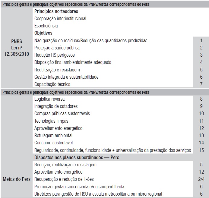 O Pers estabelece ainda que os aterros de resíduos domiciliares (RDO) não perigosos e a limpeza urbana não podem receber resíduos industriais, de saúde e perigosos, a não ser que a estrutura do aterro seja equipada para isso. De forma geral, o Plano mostra um enfoque na disposição final de RSU, a jusante do processo de gestão, enquanto a gestão integrada demandaria ações a montante desde o ciclo de produção de resíduos, voltadas para sua redução, passando também por aspectos relacionados com o planejamento e a regulação e a fiscalização. Isso implicaria, de fato, uma maior integração entre a política e o plano estadual e a política e os planos municipais, que na maior parte dos municípios do estado ainda se encontram em fase de elaboração.