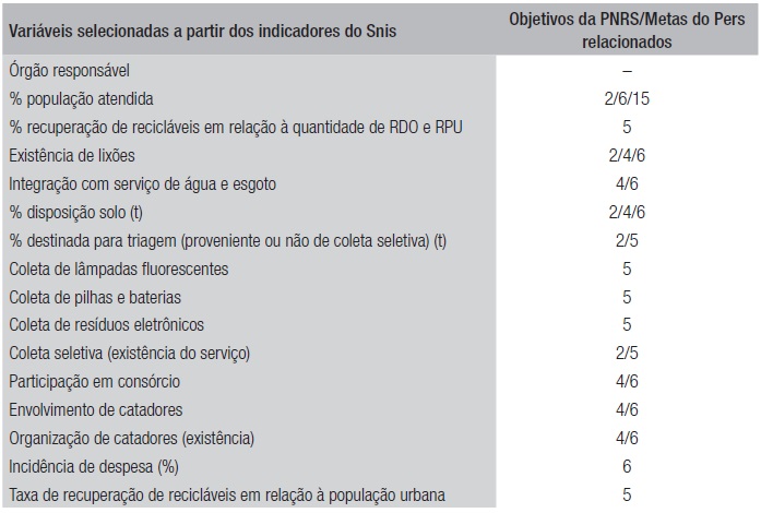 Na falta de metas quantitativas definidas pela PNRS, se propõe aqui uma análise qualitativa das lacunas. Dentro da PNRS foram identificados e codificados 15 objetivos principais, destacando os que a lei remete aos planos estaduais para definição de metas detalhadas (tabela 1). Em seguida, para criar as variáveis da análise, foram selecionados entre os indicadores do banco de dados do Snis os que de melhor forma contribuiriam para medir o nível de implementação da PNRS de cada município (tabela 2).