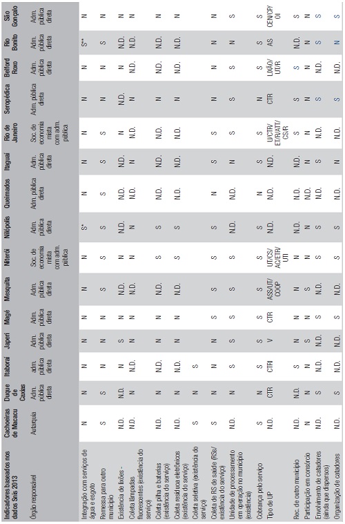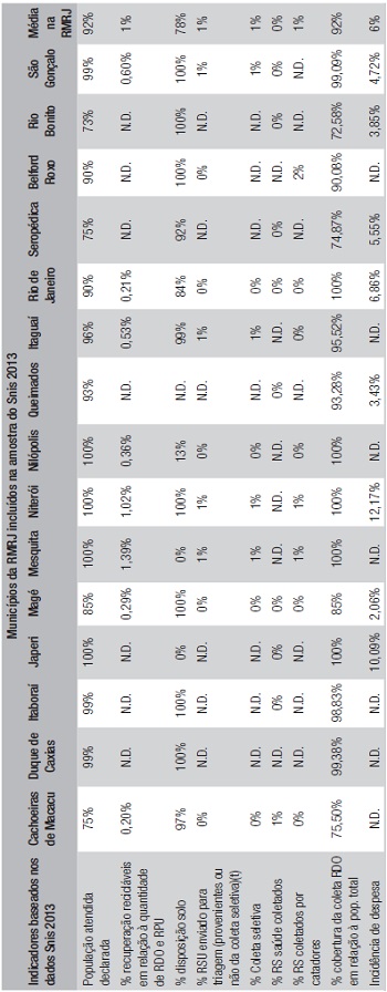 Ao considerar essas informações como referência para um quadro da implementação da PNRS na RMRJ, é preciso levar em conta a ausência de alguns dados. Para seis dos nove indicadores considerados, faltam em torno de 40-50% dos dados; entre cinco e sete municípios em cada indicador não disponibilizaram as informações.