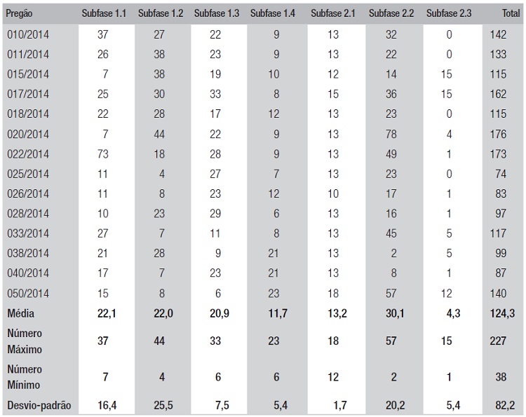 Definidas as subfases mais significativas do processo de compras, a partir da análise dos PAG, identificou-se o número de dias necessário para execução delas, conforme dados na tabela 1.