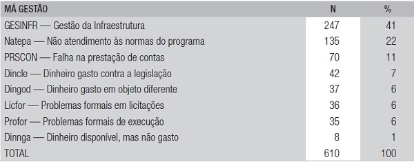A tabela 1apresenta os tipos de problemas relativos à má gestão.