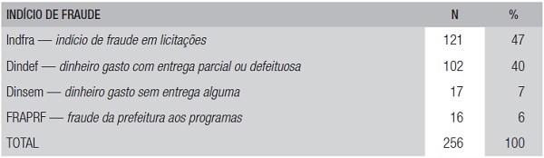 As demais categorias de indício de fraude compreendem menos de 15% dos problemas: Dinsem e FRAPRF. A primeira se refere a problemas de pagamento por um bem ou serviço sem identificação do bem ou da realização do serviço. A segunda se refere a ações da prefeitura contrárias às regras do programa e que acarretam recebimento de mais recursos federais do que previsto ou favorecimento de profissional do poder público.
