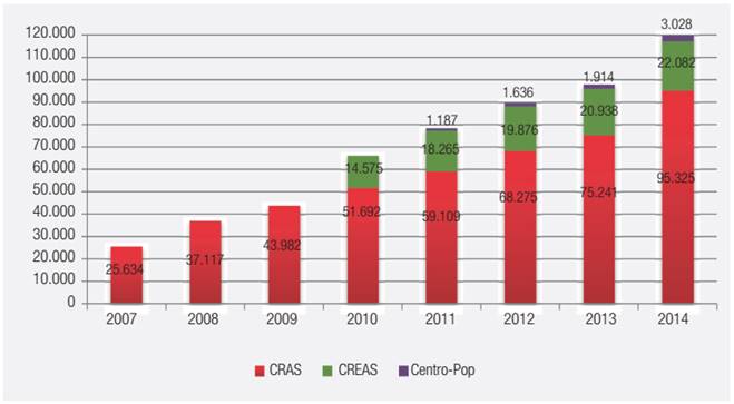 The data are impressive: until 2004, when a new left-wing government took over and the MDS was established, there were no specific and appropriate physical public units for the provision of social welfare; that is, there were no facilities for the provision of social welfare services, and therefore, there were no state human resources for the same.2 In 2013, there were already 7,883 Social Welfare Reference Centers (Centros de Referência da Assistência Social - Cras) in 5,394 municipalities with 75,241 workers; 2,249 Specialized Social Welfare Reference Centers (Centros de Referência Especializados de Assistência Social - Creas) with 20,938 employees; and 131 Homeless Population Service Centers (Centros de Atendimento à População de Rua - POP Centers) with 1,914 workers, totaling 98,093 workers responsible for the delivery of social welfare services. Figure 1 shows the hiring over time.