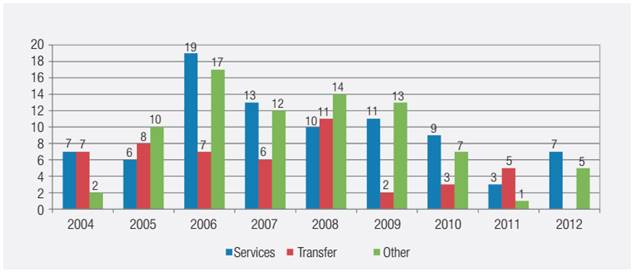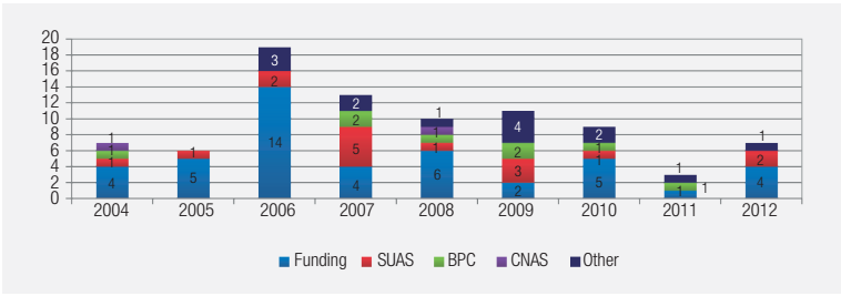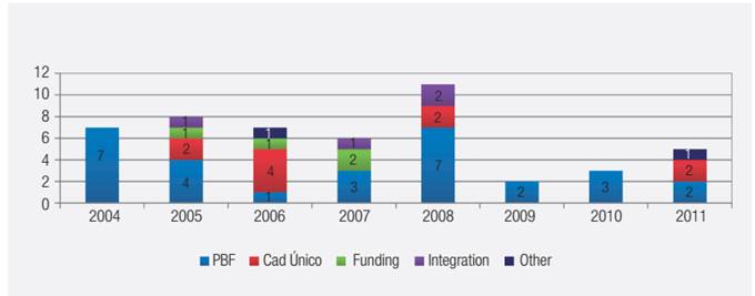 Of all of the above ordinances, 49 are related to income transfer, published by the Senarc. We can classify these ordinances by nature: those relating to the PBF, to the CadÚnico, to funding, to integration between income transfer and services, and to other issues. Figure 3 shows their distribution over time and allows us to observe the intensity of PBF regulation.