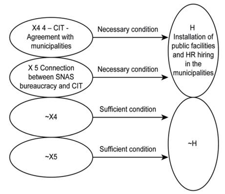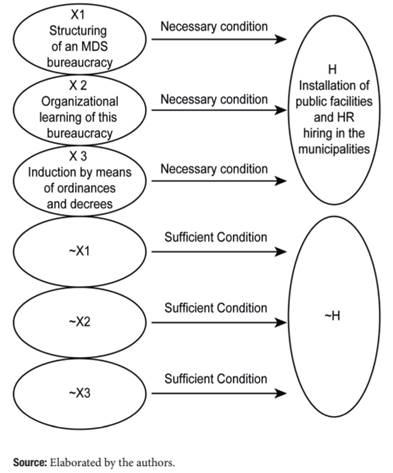 Figure 6 is a table showing the relationship (of necessity and sufficiency) of each of the factors and processes analyzed with the structuring of a specialized bureaucracy at the local level. Although the factors and processes presented here are relevant to demonstrating the performance of the MDS, both its institutional and organizational learning and its regulatory role in national policy coordination, it is plausible that none of these alone would be sufficient to induce municipalities to hire staff and provide social welfare services. Funding may have played a strong role, but we still consider that all aspects listed are necessary conditions for this result, despite being insufficient on their own to cause it. However, it is possible to infer that the absence of any of these factors would constitute a sufficient condition for the negation of the result, that is, for the non-structuring of a service provision system at the local level with its own bureaucracy, which has as a real counterfactual case the welfare policy developed during the administration of President Fernando Henrique Cardoso (Sátyro and Cunha, 2014).