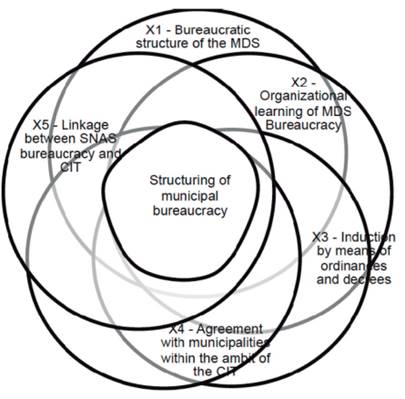 Furthermore, we argue that this induction could not be sustained if it were simply a top-down process. In this case, the centrality of the agreements in the CIT were central in creating legitimacy and, therefore, in achieving the signing up of autonomous entities. These factors did not occur at random; there was a concerted action by actors involved in the bodies (the MDS, the Cnas, and the CIT). The relationship between them and its sufficient effects on the assembly of a bureaucratic-administrative structure at the local level can be observed in the figure below.