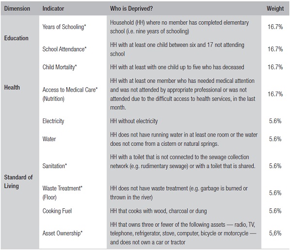 This methodology proves to be interesting given its flexibility and capacity to be adapted to different cultural and national contexts. For example, Mexico, Colombia, Bhutan and the Philipines have adopted official multidimensional poverty measures and each one has been adapted to that country’s specific cultural and political context. It also enables a comparative perspective and analysis that can be broken down into territories or geographic regions in order to indicate where and why the population is poor. It allows for the decomposition by indicators and has an easy and consistent statistical method, among several other advantages.