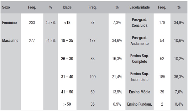 A plataforma foi escolhida pela disponibilidade dos dados sobre os acessos e tipos de contribuição de cada usuário respondente na plataforma. Além de que, na literatura, há relatos de que as ideias enviadas por membros da população respondente desta pesquisa resultaram em inovações nas ações e projetos dessa instituição pública, sendo um caso de sucesso do uso de plataformas de envio de ideias (Santos, 2015). Obteve-se retorno de 510 questionários, por meio dos quais foi analisado o perfil da amostra participante, de acordo com a tabela 1.