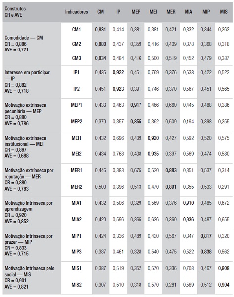 Após essas exclusões, a validade convergente dos indicadores foi confirmada, pois, conforme a tabela 2, todas as cargas padronizadas são superiores a 0,7. A validade discriminante das variáveis também foi confirmada, pois a correlação de cada indicador (linha) relativa a seu respectivo construto (coluna) é maior do que todas as correlações com os demais construtos, conforme apresentado na tabela 2. Isso significa, por exemplo, que todas as variáveis que representam a motivação intrínseca pelo social possuem maior correlação entre si do que com as variáveis de outros construtos.
