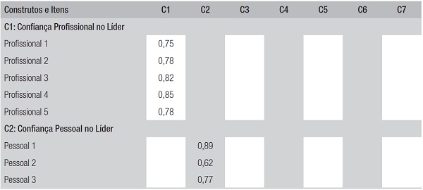 A verificação da consistência foi realizada pela análise das variáveis latentes utilizando o modelo de equação estrutural com coeficientes padronizados. As variáveis analisadas são: confiança pessoal no líder, confiança profissional no líder, percepção da comunicação interna, percepção de consistência da gestão, percepção de integridade da gestão, percepção de compartilhamento e delegação de autoridade e percepção de demonstração de preocupação com os subordinados.