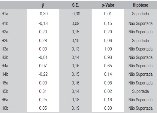 Ao analisar as relações entre as variáveis independentes e a variável dependente confiança profissional no líder, podemos perceber que, conforme proposto na hipótese H1a, existe uma relação direta e inversa com confiança profissional no líder (β = -0,30; SE = 0,89; p < 0,01). Quanto maior a distância de poder, menor é a confiança profissional no líder imediato. Contudo, em relação a esse construto, nenhuma outra hipótese é confirmada. Diante dos resultados, as hipóteses H2a, H3a, H4a, H5a e H6a foram rejeitadas, uma vez que não apresentaram significância estatística. Em termos práticos, a percepção de comunicação interna, de percepção de consistência e integridade na gestão, de compartilhamento e delegação de autoridade e demonstração de preocupação com os empregados não possuem relação com a confiança profissional no líder no contexto do Bope/RJ.