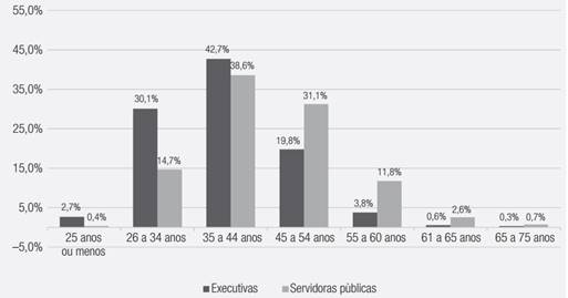 A comparação etária entre os dois grupos supracitados revelou diferenças significativas de distribuição (Gráfico 1). As executivas pareceram ser mais jovens do que as servidoras públicas, com idade média de, respectivamente, 39 e 44 anos. A despeito dessa diferença de idade, as respondentes são predominantemente casadas em ambos os grupos e, em geral, têm 1 ou 2 filhos. Desse modo, considerou-se que se trata de grupos comparáveis, no que tange ao papel socialmente construído para a mulher no Brasil.