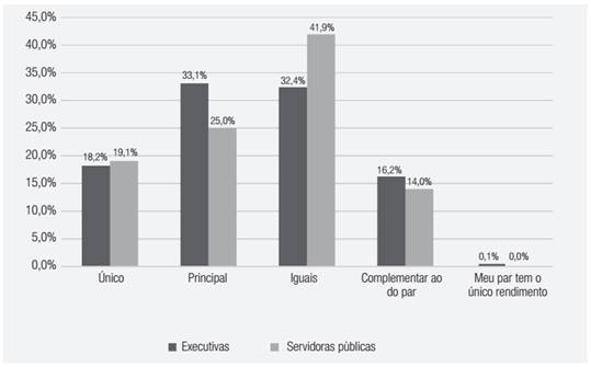 A partir da amostra, em ambos os casos, as mulheres parecem empoderadas financeiramente em relação ao seu par amoroso. Se, como visto na literatura, anteriormente a mulher tinha pouquíssimas possibilidades de fazer carreira fora dos guetos tradicionais como saúde e educação no Brasil (Bruschini, 2004; Louro, 2013; Mota-Santos et al., 2014), atualmente, ela começou a ocupar cargos estratégicos tão bem remunerados quanto os homens na mesma posição, tanto nas organizações privadas (Carvalho et al., 2014) quanto públicas, como mostra esta pesquisa. Se considerados os dois grupos juntos, para 49,9% das respondentes o rendimento é o único ou o principal da família, enquanto somente para 15,9% o par amoroso tem o principal ou o único rendimento (Tabela 1). Tal empoderamento se manifesta em ambos os grupos: 51,3% das executivas e 44,1% das servidoras públicas têm o rendimento único ou o principal da família (Gráfico 2).