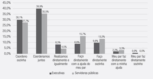 O teste de qui-quadrado evidenciou diferenças significativas entre as executivas e as servidoras públicas, no que se refere à responsabilidade pelas atividades do lar (p < 0,05). Nesse perspectiva, vale observar que a divisão equitativa das atividades do lar, seja coordenando o trabalho dos empregados ou realizando-o diretamente, parece mais prevalente entre as executivas (48,2%) do que para as servidoras públicas (40%) (Gráfico 4). Isso corrobora a literatura (Belle, 1993; Calas & Smircich, 1997; Schilling, 2015), que salienta a carreira pública como menos problemática em termos de compatibilização da vida pessoal e profissional do que o setor privado. Na mesma linha, a realização direta das atividades, ora sozinhas, ora com a ajuda do par amoroso, parece mais prevalente entre as servidoras públicas (28,9%) do que entre as executivas (18,6%) (Gráfico 4). O teste de qui-quadrado trabalhou com as hipóteses: