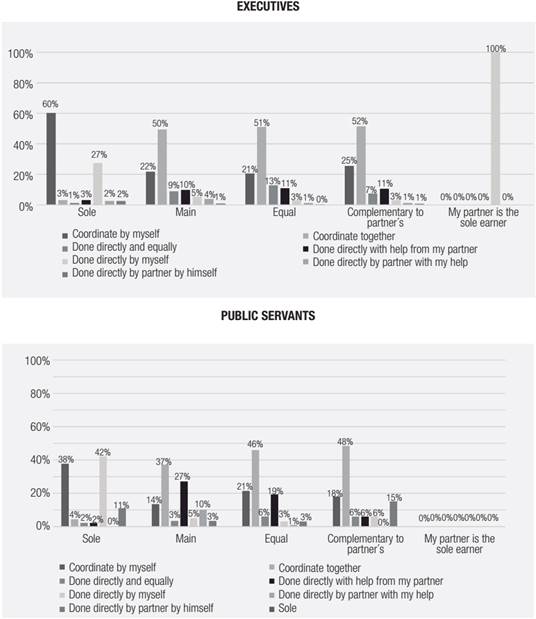 A condição das servidoras públicas, no que tange ao empoderamento financeiro e à responsabilidade pelas atividades do lar, é análoga à das executivas, ou seja, maior empoderamento financeiro não favorece maior equilíbrio quanto à responsabilidade pelas atividades do lar em relação ao homem (Gráfico 5). Para esse grupo, no entanto, há marcante diferença em relação às executivas. As servidoras públicas realizam as atividades do lar diretamente sozinhas ou com ajuda do par amoroso mais frequentemente do que as executivas, para as quais a coordenação com ajuda de empregados parece a alternativa quase unívoca (Gráfico 5).