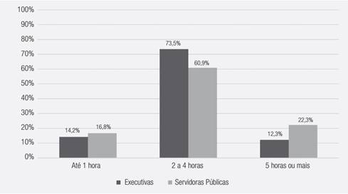 Nessa perspectiva, a proporção de mulheres que cuida de seus filhos por 5 horas diárias é quase o dobro entre as servidoras públicas (22,3%) quando comparadas com as executivas (12,3%) (Gráfico 6).