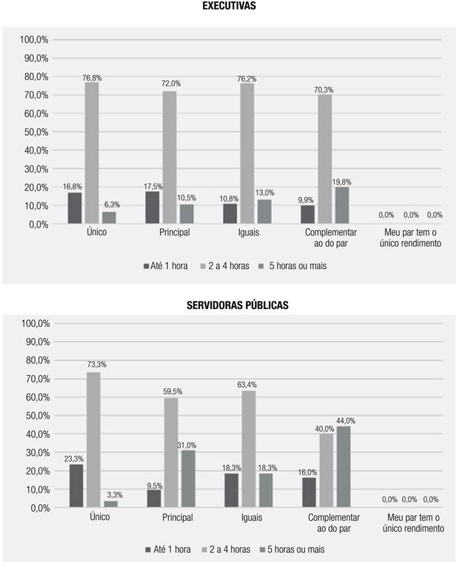 No entanto, há diferenças significativas entre as executivas e as servidoras em relação ao tempo de cuidado com os filhos, para as classes de rendimento principal e complementar ao do par amoroso. Observou-se que 44% das servidoras públicas que possuem rendimento complementar ao do par cuidam dos filhos por 5 horas ou mais diariamente, o que ocorre com somente 19,8% das executivas (Gráfico 6).