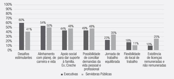 Parece que os aspectos relacionados com a carreira e os desafios da organização são mais estimulantes para as executivas, o que pode levá-las a priorizá-los sobre o equilibrio entre o trabalho e a vida pessoal. Para as servidoras públicas, o alinhamento com a carreira também é importante, mas o equilíbrio, o apoio social e a possibilidade de conciliar a vida pessoal e profissional são tão importantes quanto (Gráfico 8).