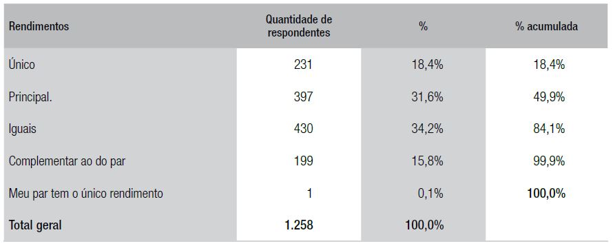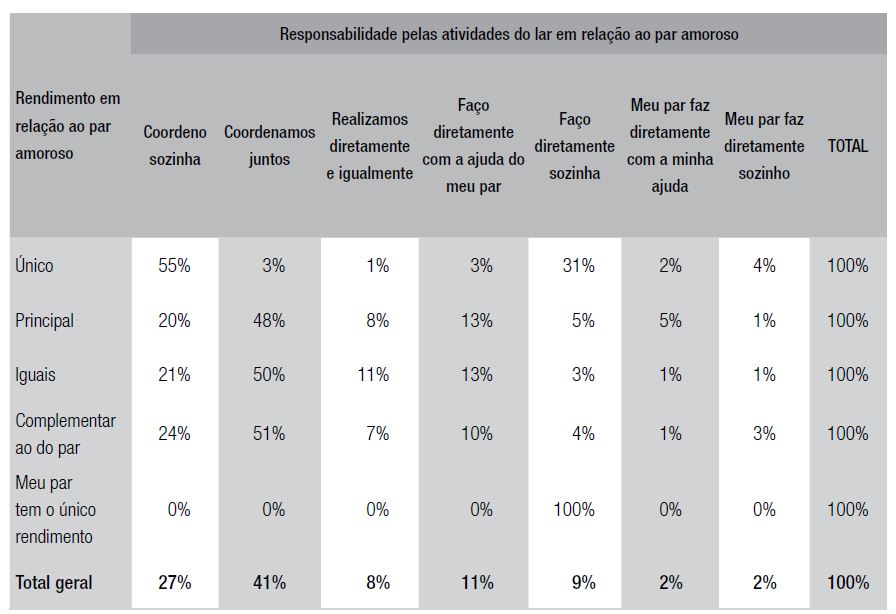 A despeito do maior empoderamento financeiro em relação ao par amoroso, as mulheres participantes da pesquisa também parecem concentrar a responsabilidade pelas atividades de cuidado do lar. Observa-se, por exemplo, que apenas 6% das respondentes que possuem o único ou o principal rendimento da família disseram que seus pares amorosos realizam as atividades do lar diretamente sozinhos ou com sua ajuda (Tabela 3). Esse achado de pesquisa corrobora a literatura no tocante à importância do rendimento superior da mulher em relação ao homem como, ainda assim, sendo incapaz de reverter a tendência de negociar uma divisão mais igualitária das tarefas domésticas e do cuidado com os filhos (Madalozzo et al., 2010; Wolff, 2010). Observa-se, ainda, que das mulheres com o único rendimento da família, 55% coordenam sozinhas e 31% realizam diretamente as atividades do lar (Tabela 3).