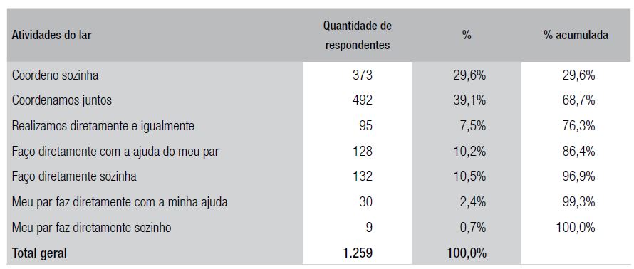 A responsabilidade pelas atividades do lar sempre foi mais atribuída às mulheres do que aos seus pares amorosos, homens, como amplamente salientado na literatura (Badinter, 1985; Billing, 2011; Biroli, 2013; Mota-Santos et al., 2014). Ao serem consideradas conjuntamente, 29,6% coordenam sozinhas as atividades do lar realizadas por empregados e 20,7% as realizam diretamente, ora sozinhas, ora com a ajuda do par amoroso (Tabela 2). Além disso, somente 3,1% das mulheres entrevistadas responderam que seus pares amorosos realizam as atividades do lar diretamente sozinhos ou com sua ajuda (Tabela 2).