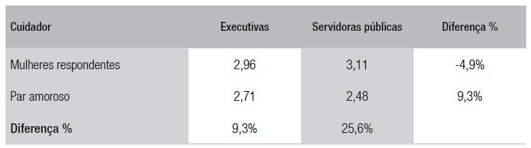 O “rendimento em relação ao par amoroso”, bem como “os cuidados com os filhos” analisados separadamente pareceram, de novo, evidenciar que a carreira no serviço público, mais do que nas empresas privadas, poderia favorecer o reforço da construção social histórica em torno do feminino e do masculino. Esse achado de pesquisa vai além da literatura. Tal preceito parece ainda mais evidente quando conjugadas essas duas variáveis na comparação entre as executivas e as servidoras públicas.