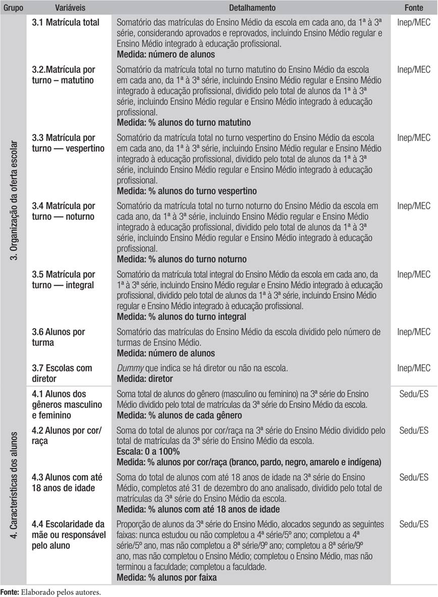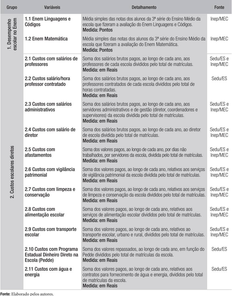 O banco de dados foi organizado por escola/ano, em quatro grupos de informações - “Desempenho escolar no Enem”; “Custos escolares diretos”; Organização da oferta escolar; e “Características dos alunos”, como detalhado nos apêndices A e B -, com base em Albernaz, Ferreira e Franco (2002), Soares (2007) e Amâncio-Vieira et al. (2015).