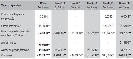 Das variáveis de controle - características de alunos, o fato da mãe nunca ter estudado ou não completado a 4ª série do Ensino Fundamental impactou todos os quantis analisados de forma negativa, com variação dos coeficientes entre 105,0485 e 120,0869. Quanto à proporção de alunos negros, observou-se impacto negativo somente para o desempenho médio das escolas no quantil 90. De qualquer modo, deve-se destacar que, para esse grupo, a cada 10% de alunos que declararam ter essa característica, ela representou 6,15899 pontos a menos de média na avaliação. Quanto ao gênero do aluno, a proporção de meninas matriculadas na escola apareceu afetando positivamente os quantis 10 e 50, com coeficientes de 91,4620 e 76,5536.