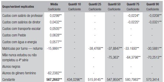 De modo geral, conforme as tabelas 3 e 4, nota-se que para os grupos de variáveis custos escolares diretos e organização da oferta escolar houve comportamento semelhante em termos dos quantis 10, 25 e 50 da amostra. Ou seja, escassas foram as variáveis relacionadas com esses grupos que se mostraram significativas para explicar o desempenho.
